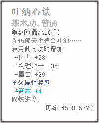 ⑤心法大多会在装备时随击杀敌人而获得修为,不断提升,直到瓶颈,技能大多靠用修为主动提升。