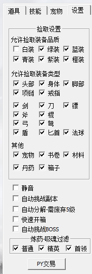 ①拾取设置:可对游戏内拾取物做筛选,文字前方显示√即为选定,空白则为未选定。