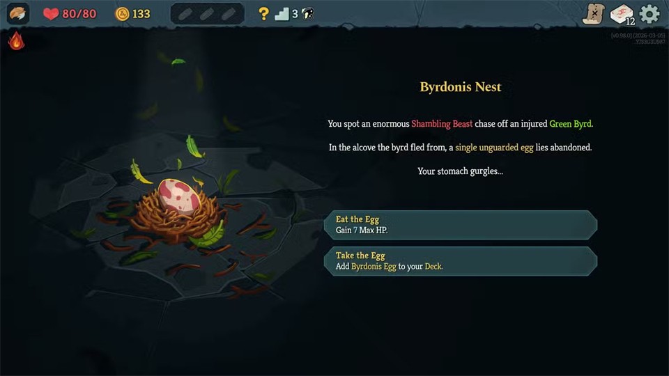 这两种选择都可行且没有负面影响,除了会给你的牌组添加暂时无法使用的卡牌。如果提升的最大生命值对你更有价值,那就吃蛋吧。否则,拿着蛋开始拜尔多尼斯蛋任务。