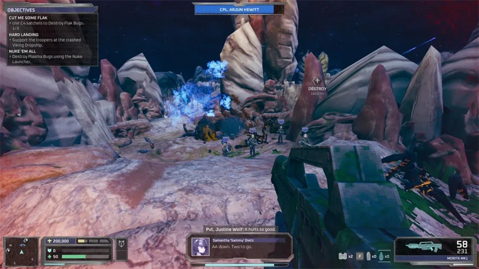 2、专属反虫族武器体系:配备超30种联邦制式作战装备,覆盖突击武器、重火力、爆炸物、支援设备四大类别,从搭载三连发模式的莫里塔MK-II步枪,到可召唤部署的机甲战斗平台应有尽有。每款武器都有专属的虫族克制机制,搭配个性化升级路线,打造专属作战流派。