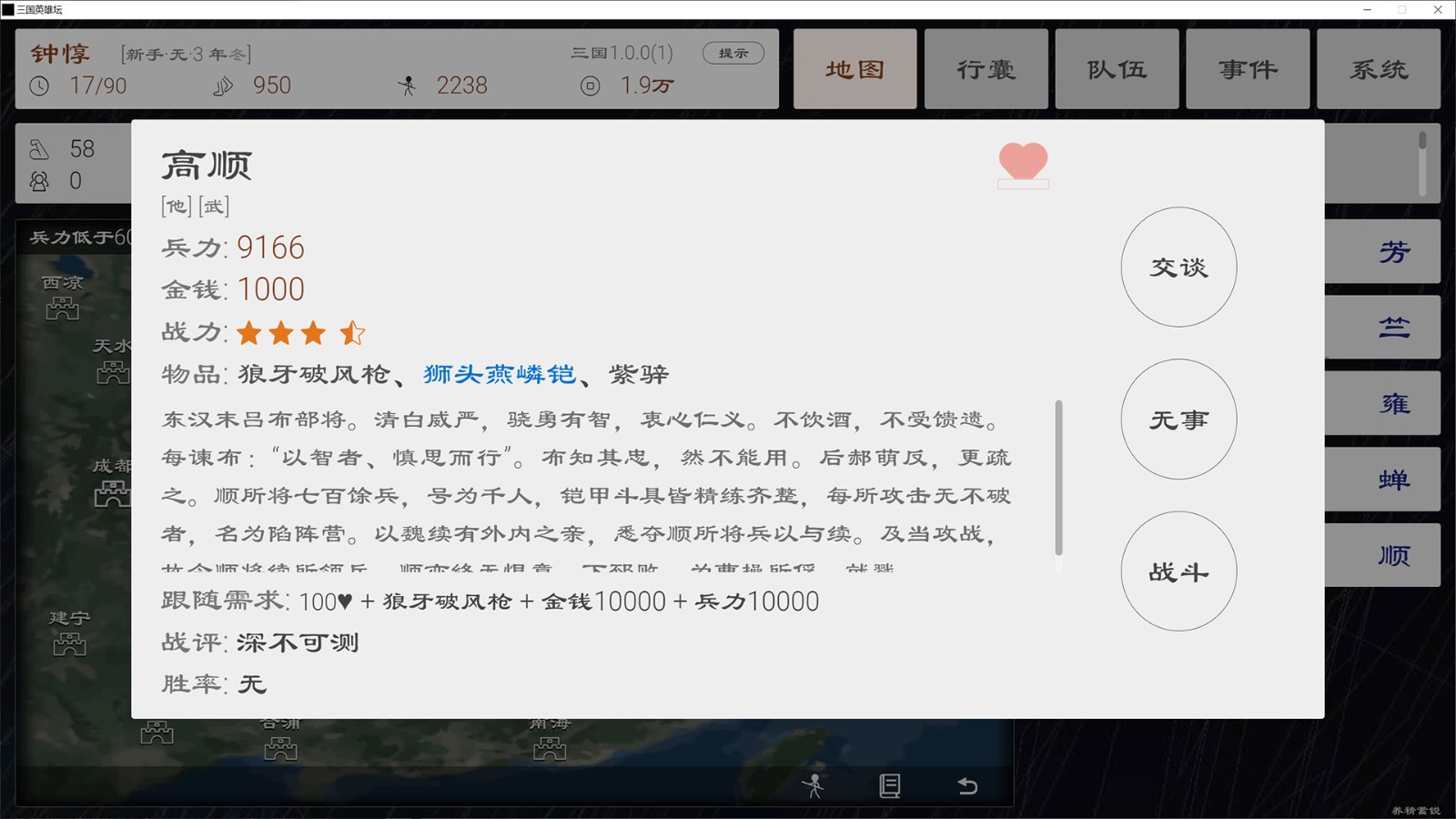 4、随机点击一方可查看该城的具体信息,选择交谈/无事/战斗。