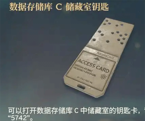 可以打开数据存储库C中储藏室的钥匙卡,背面写着“5742”,在中转站里,数据库c的底层一个科学家尸体旁找到,不过还需要通电才能使用该钥匙卡打开储藏室,5742指的是通电后按柜子上按钮的顺序。