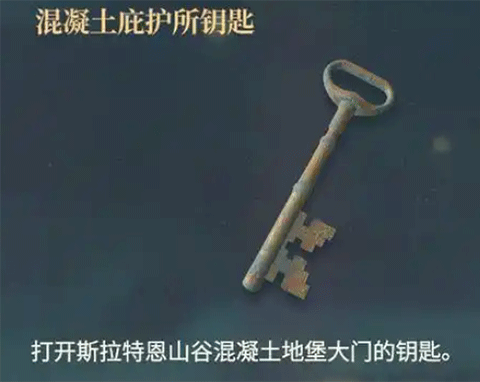 打开斯拉特恩山谷混凝土地堡大门的钥匙;在莫莉处购买获得,可以打开山谷地图中下水道隧道的侧边混凝土铁门。