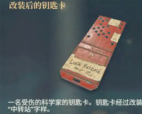 一名受伤的科学家的钥匙卡。钥匙卡经过改装,上面写有“中转站”字样。主线任务中,最开始的那名穿着防化服的科学家给的,能打开中转站的大门。