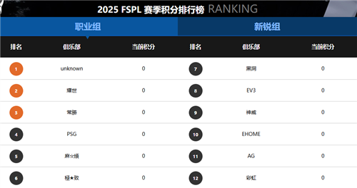 2025《街头篮球》FSPL职业联赛常规赛共有12支职业俱乐部参赛,除了UNKNOWN、耀世、PSG、麻☆煩、極★致、黑洞、神威、EHOME、AG以及彩虹10支老牌战队之外,还有新加盟的常勝以及EV3俱乐部,他们将进行8周的赛程争夺最终的常规赛冠军。