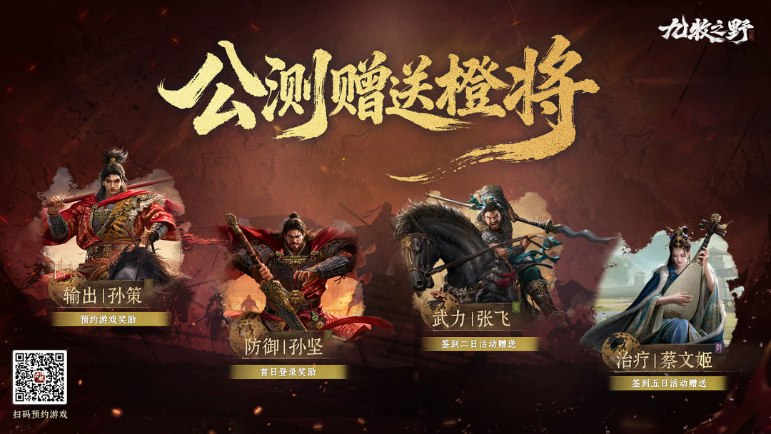 现在预约《九牧之野》,可在公测后领取张飞(武力型)、孙坚(防御型)、孙策(武力型)、蔡文姬(治疗型),共计4名传奇橙将。