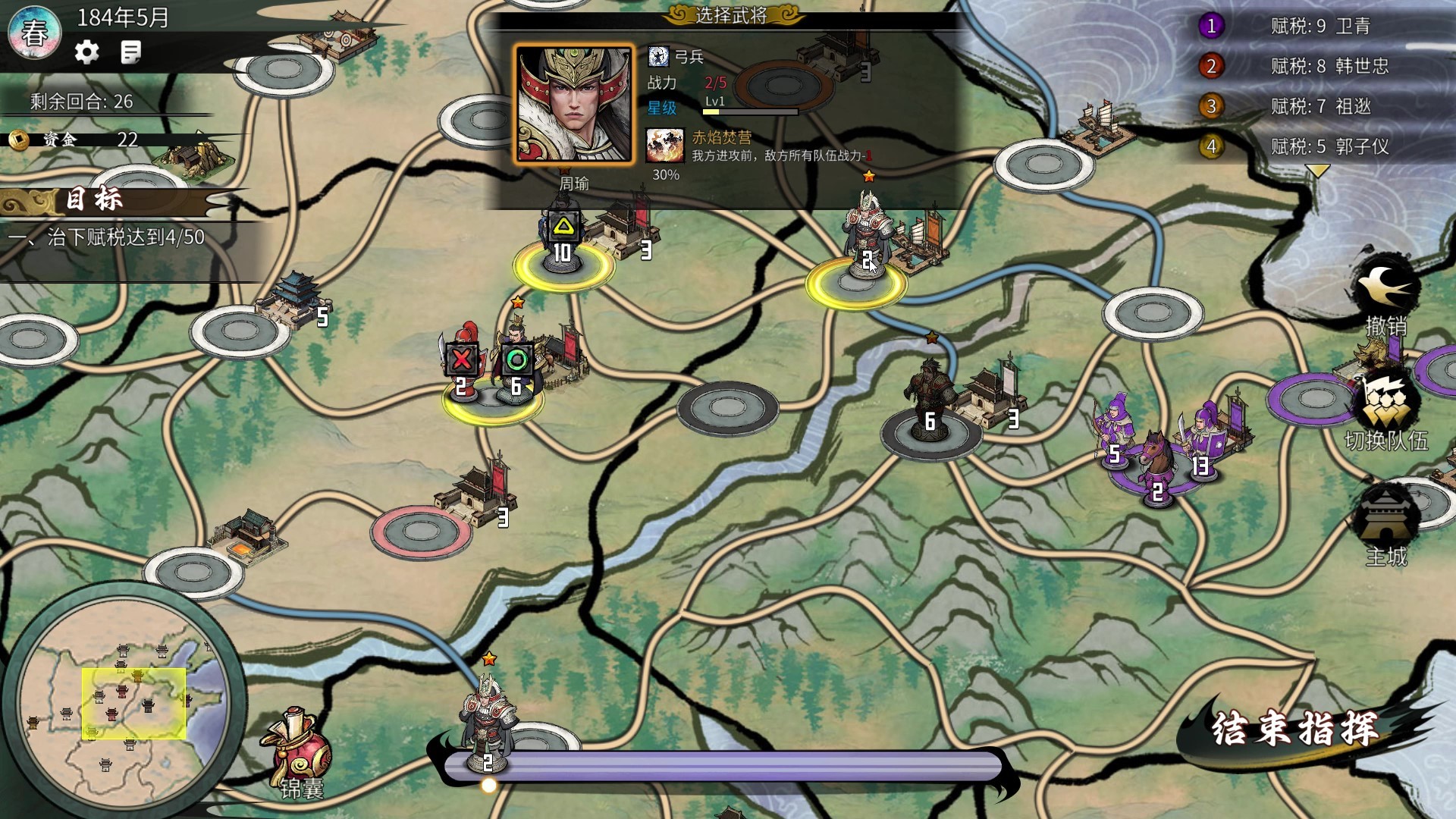 游戏团队墨春秋以“丹青为骨,墨色为魂”为美术核心观念,通过虚实结合的笔法,构建出一个既写意又凝重的东方战争画卷。《丹墨三国:弈》呈现的山脉以笔锋渲染、河流以墨线勾勒,道路与势力分布层次清晰,展现出“以画为棋盘”的独特视觉感受。画面中央的战局布置一目了然,玩者麾下部众与敌方势力分布在不同城池与路径节点上,每一处据点都以圆环标示控制范围。而边角处的缩略图,让整个界面在保持策略游戏清晰逻辑的同时,巧妙融合了东方山水意境与战棋信息设计。