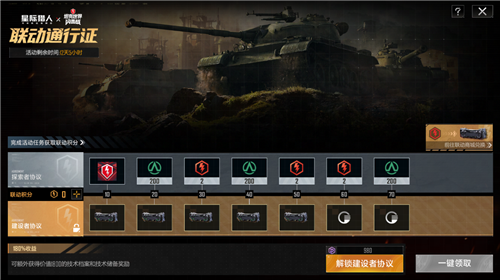 完成每日联动任务,提升“联动庆典通行证”等级,即可免费领取“钢铁洪流”静态徽记、联动庆典纪念币、外观积分等多重好礼。