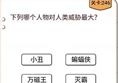 相信很多玩家都看过漫威和dc这两个系列的电影,其中的小丑、蝙蝠侠及万磁王等人物深入人心,游戏的第246关之中需要玩家找出对人类威胁最大的一个人,很多玩家可能都会选择灭霸,这个答案却是错的,下面就讲解下攻略内容。
