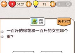 相信很多玩家都听过这个问题,一百斤的棉花和一百斤的女生哪个重?而这个问题也就是游戏中的第202关题目,有听说过的玩家可能一下子就通关了,不清楚的玩家可能需要冥思苦想其中的关键点,这里就讲解下攻略内容。