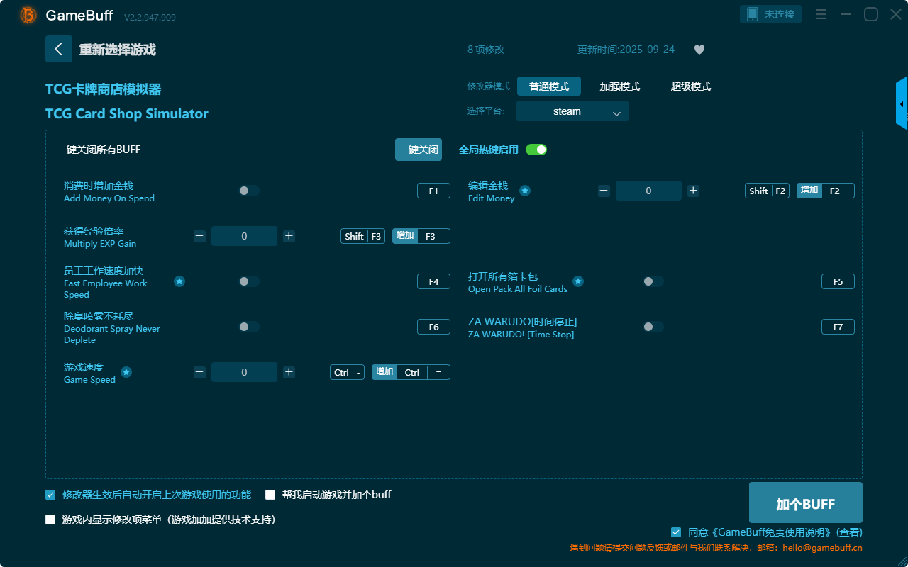TCG卡牌商店模拟器八项修改器是一款操作极其简单的游戏辅助修改器工具,功能强大实用,可以自由设置拥有消费时增加金钱、编辑金钱、获取经验倍率、员工工作时速度加快、除臭喷雾不耗尽、游戏速度等八项功能内容,轻松解决游戏中遇到的困难,感兴趣的玩家千万不要错过哦!