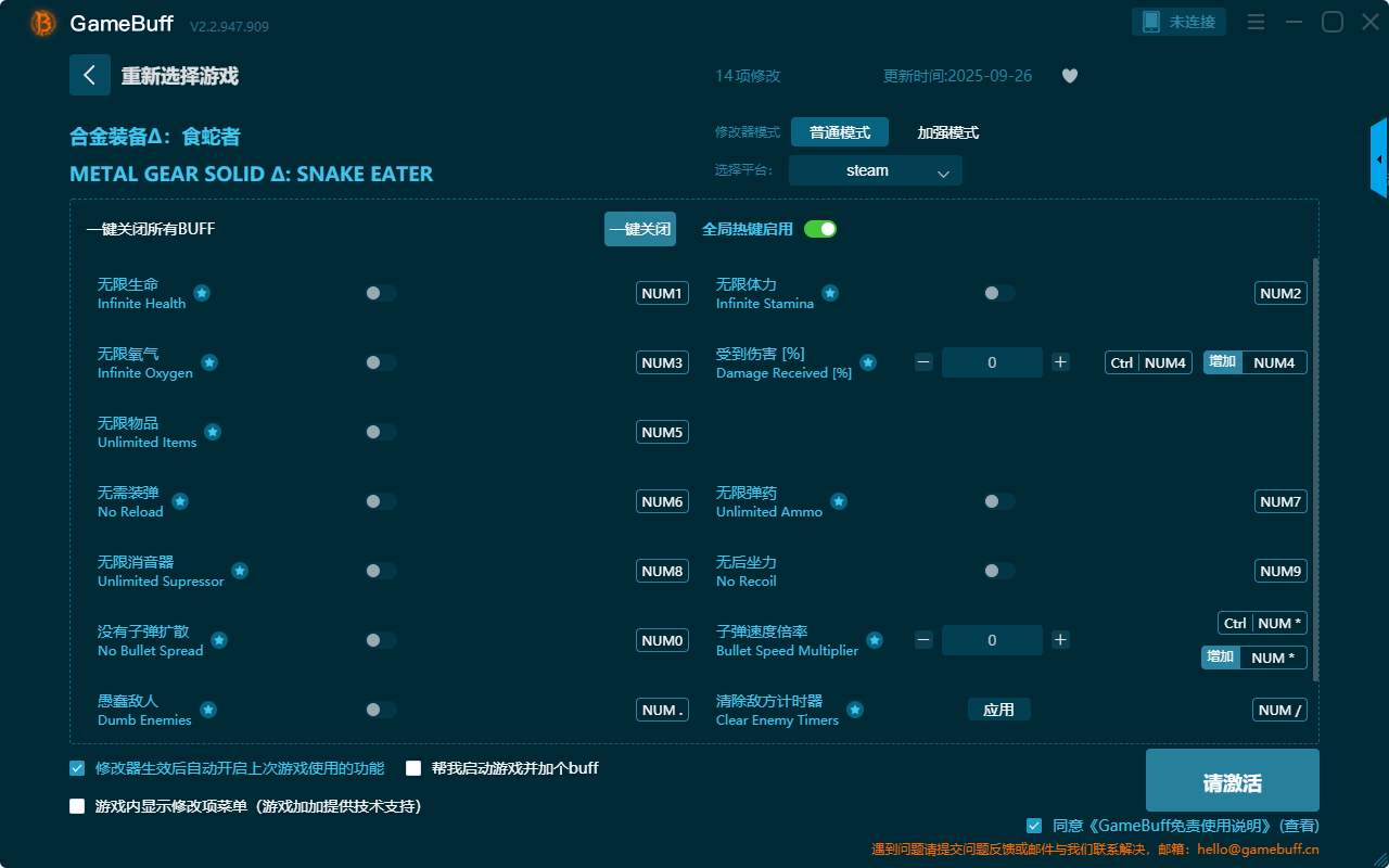 合金装备Δ:食蛇者十四项修改器是一款功能强大实用的游戏辅助修改器工具,操作极其简单,可以自由设置拥有无限生命、无限体力、无限氧气、受到伤害、无限弹药、无需装弹、愚蠢敌人、子弹速度倍率、消除敌方计时器、游戏速度等十四项功能内容,感兴趣的玩家千万不要错过哦!