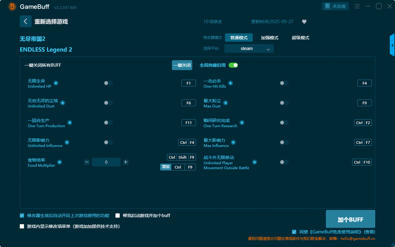 无尽帝国2十项修改器是一款功能强大实用的游戏辅助修改器工具,操作也十分的简单,可以自由设置拥有无限生命、一击必杀、最大粉尘、最大影响力、战斗外无限移动、无限影响力、食物倍率、一回合生产、瞬间研究完成、无穷无尽的尘埃等十项功能内容,感兴趣的玩家千万不要错过哦!