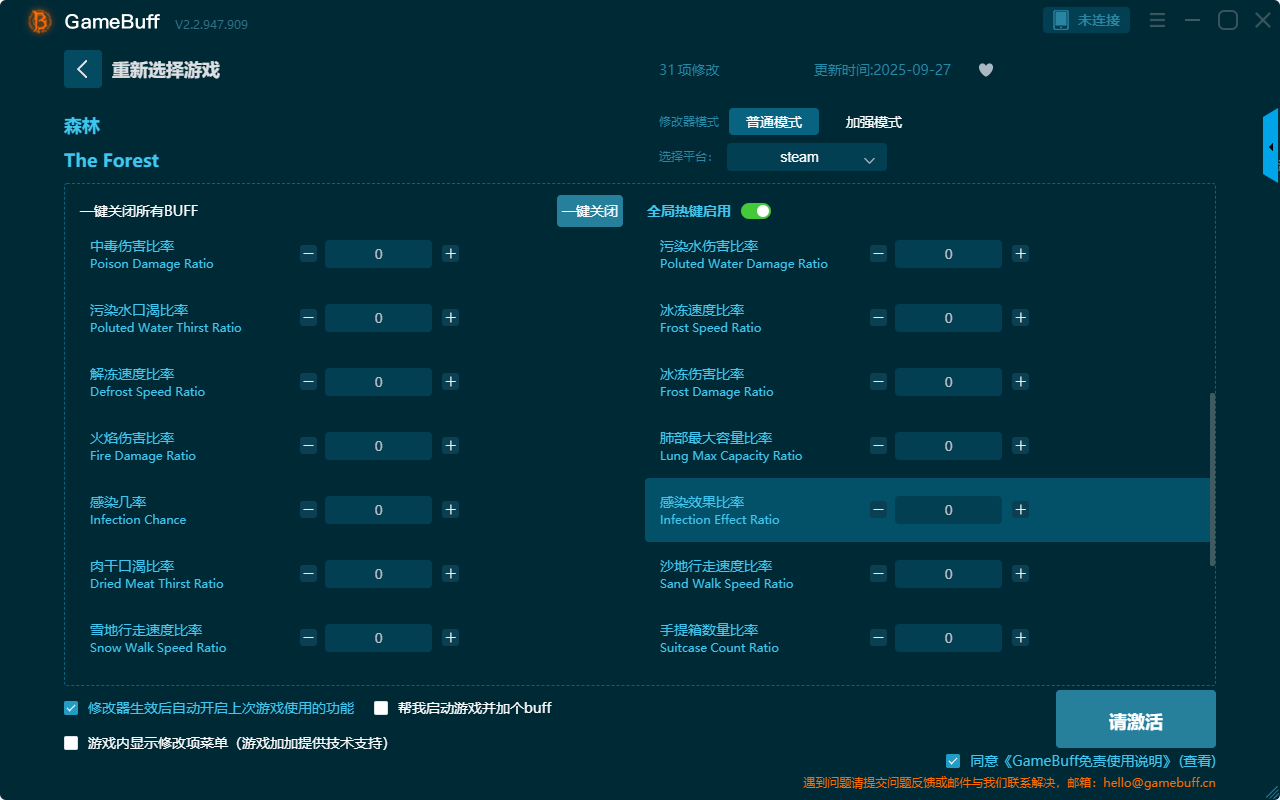 森林三十一项修改器是一款功能十分强大的游戏辅助修改器工具,操作也很简单,可以自由设置拥有体温恒定、无限物品、污染水伤害比率、中毒伤害比率、超级跑动速度、超级物品限制、稳定体温、手提箱数量比率、沙地行走速度比率、雪地行走速度比率、感染几率、肉干口渴比率、冰冻伤害比率、解冻速度比率、火焰伤害比率、无限生命、无限体力等三十一项功能内容,感兴趣的玩家千万不要错过哦!