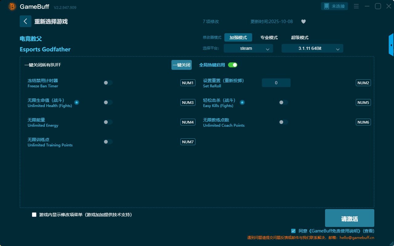 电竞教父七项修改器是一款操作极其简单的游戏辅助修改器工具,可以自由设置拥有无限生命值、无限能量、无限训练点、无限教练点数、轻松击杀(战斗)、设置重置(重新投掷)、冻结禁用计时器等七项功能内容,感兴趣的玩家千万不要错过哦!