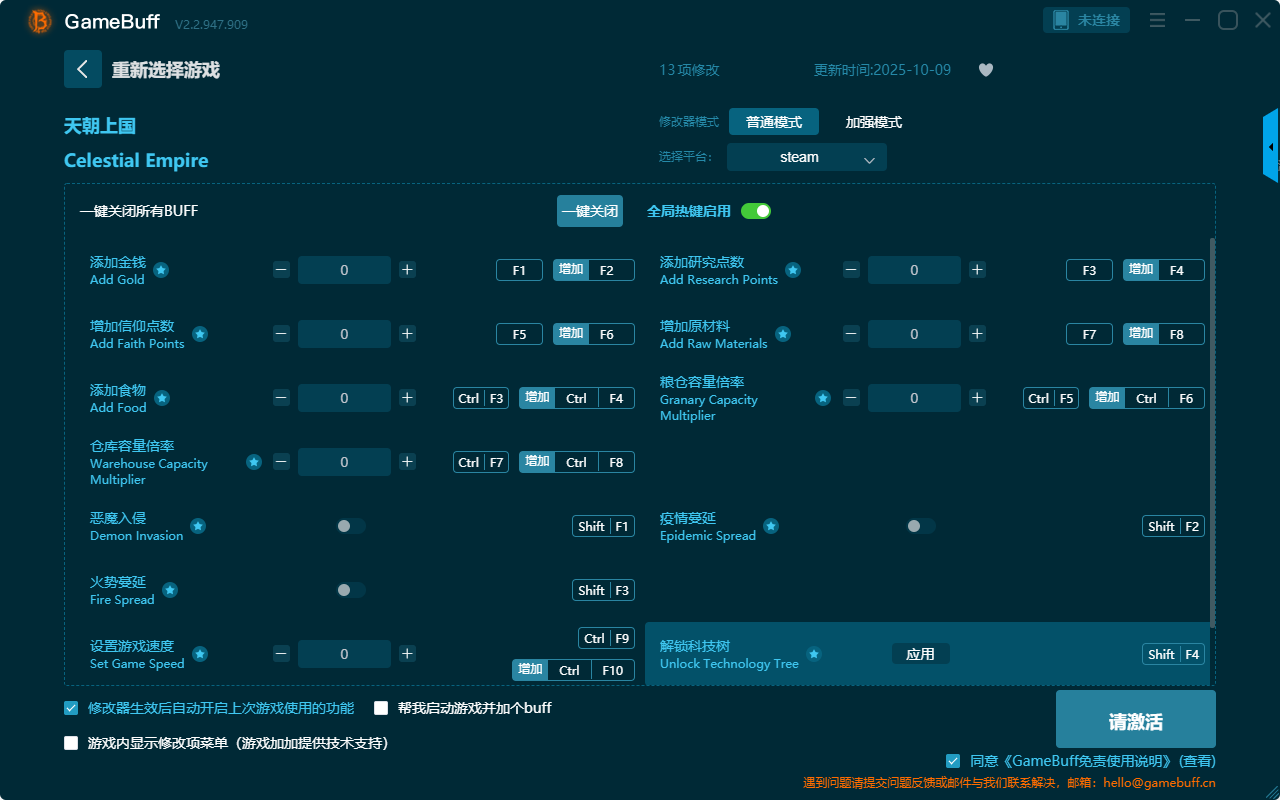 天朝上国十三项修改器是一款操作极其简单的游戏辅助修改器工具,根据在游戏中遇到的困难与挑战自由设置拥有添加金钱、添加研究点数、疫蔓延、解锁科技树、设置游戏速度、火势蔓延、恶魔入侵、添加食物、增加信仰点数、解锁奇迹、仓库容量倍率等十三项功能内容,感兴趣的玩家千万不要错过哦!