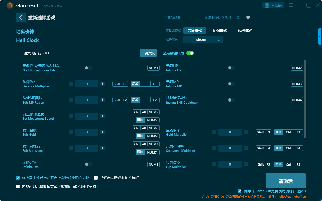 地狱丧钟十八项修改器是一款操作极其简单的游戏辅助修改器工具,功能强大实用,根据本身的需求自由设置拥有无敌模式、防御倍率、无限HP、无限MP、技能瞬间冷却、金钱倍率、编辑金钱、无限经验、经验倍率、编辑灵魂石、一击必杀、超级伤害、锁定时间、设置游戏速度等十八项功能内容,感兴趣的玩家千万不要错过哦!