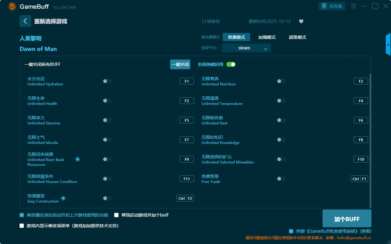 人类黎明十三项修改器是一款功能强大实用的游戏辅助修改器工具,操作也十分的简单,可以自由设置拥有水分充足、无限营养、无限温度、无限的知识、无限选择的矿山、快速建造、无限士气、无限河岸资源、免费贸易等十三项功能内容,感兴趣的玩家千万不要错过哦!
