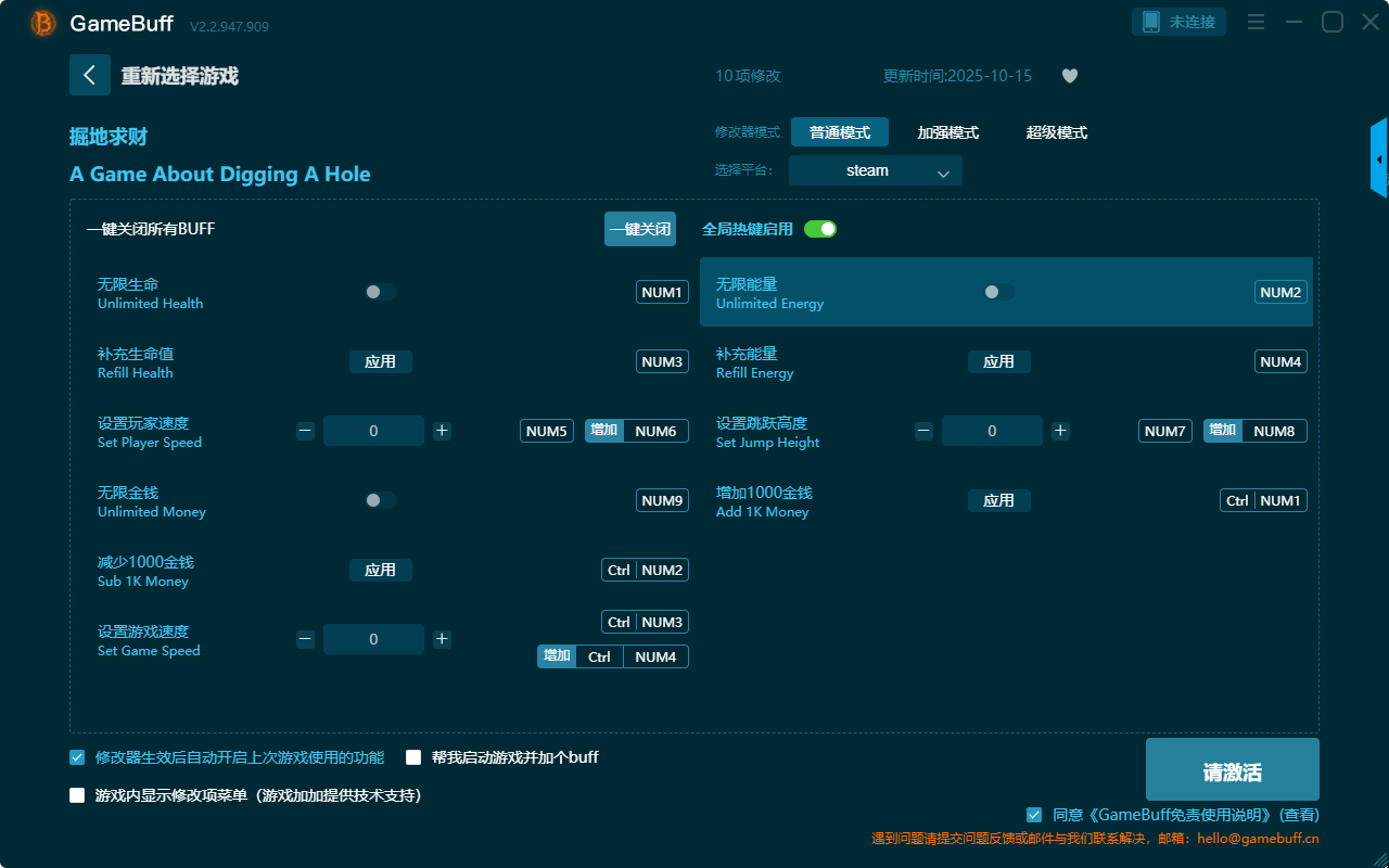 掘地求财十项修改器是一款可以自由根据本身游戏中遇到的困难挑战自由点击设置修改,功能强大实用,操作也很简单,可以一键设置拥有无限生命、补充生命值、无限能量、补充能量、设置跳跃高度、增加1000金钱、无限金钱、减少1000金钱、设置游戏速度等十项功能内容,感兴趣的玩家千万不要错过哦!