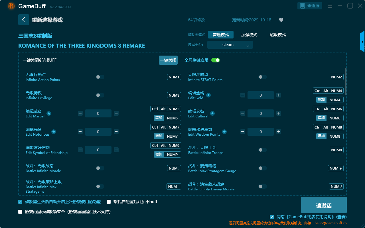 三国志8重制版六十四项修改器是一款功能十分强大的游戏辅助工具,可以自由修改六十四项功能内容,包含无限行动点、无限战略点、战斗;无限士兵、战斗:清空敌人战意、编辑武名、编辑恶名、编辑友好信物、无限特权、战斗:无限策略上限、战斗:满策略槽、最高民心、无限经验、经验倍率、和离书、满秘诀、割袍断义等,解决在游戏中遇到的困难,感兴趣的玩家千万不要错过哦!