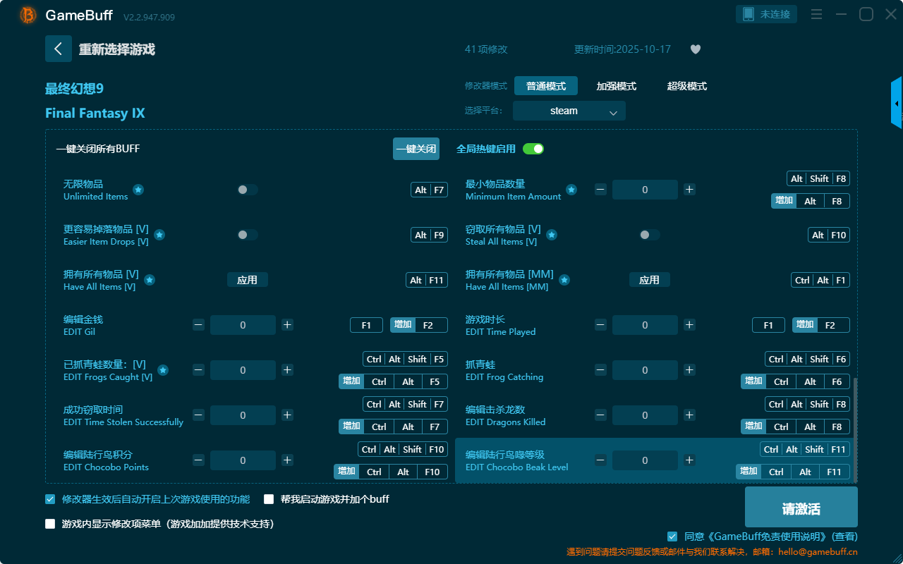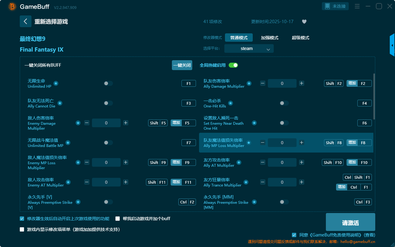 最终幻想9四十一项修改器是一款功能自由设置拥有无限生命、一击必杀、队友无法死亡、队友伤害倍率、敌人伤害倍率、友方攻击倍率、永久先手、无限物品、编辑金钱、敌人无法攻击、一击破防、满必杀槽、100%暴击率、无限魔法、设置游戏速度、经验倍率、ABP倍率、无限魔法石等四十一项功能内容的游戏辅助修改器工具,感兴趣的玩家千万不要错过哦!
