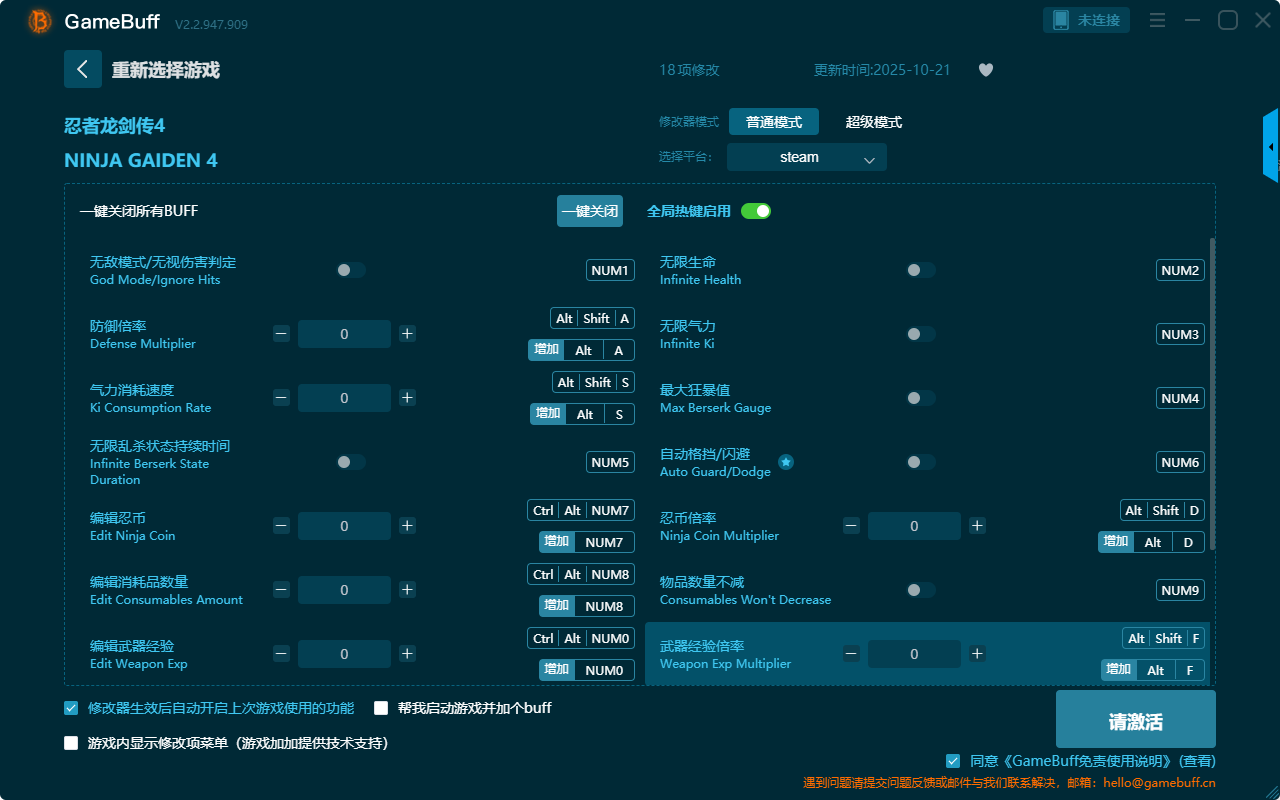 忍者龙剑传4十八项修改器是一款操作极其简单的游戏辅助修改器工具,功能也很强大实用,可以自由设置拥有无敌模式、无限生命、无限气力、最大狂暴值、忍币倍率、物品数量不减、物品经验倍率、编辑忍币、编辑武器经验、防御倍率、无限乱杀状态持续时间、超级伤害、一击必杀等十八项功能内容,感兴趣的玩家千万不要错过哦!