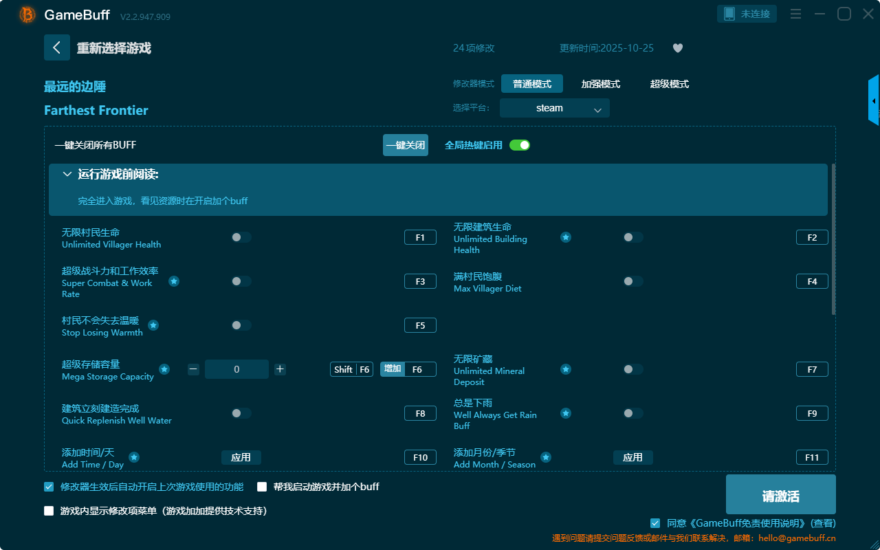 最远的边陲二十四项修改器是一款功能强大实用的游戏辅助修改器工具,可以自由设置拥有二十四项功能内容,帮助自己解决在游戏中遇到的各种困难挑战,设置拥有无限村民生命、无限建筑生命、满村民饱腹、添加时间、添加月份、总是下雨、村民不会失去温暖、建筑立即建造完成等二十四项功能内容,感兴趣的玩家千万不要错过哦!