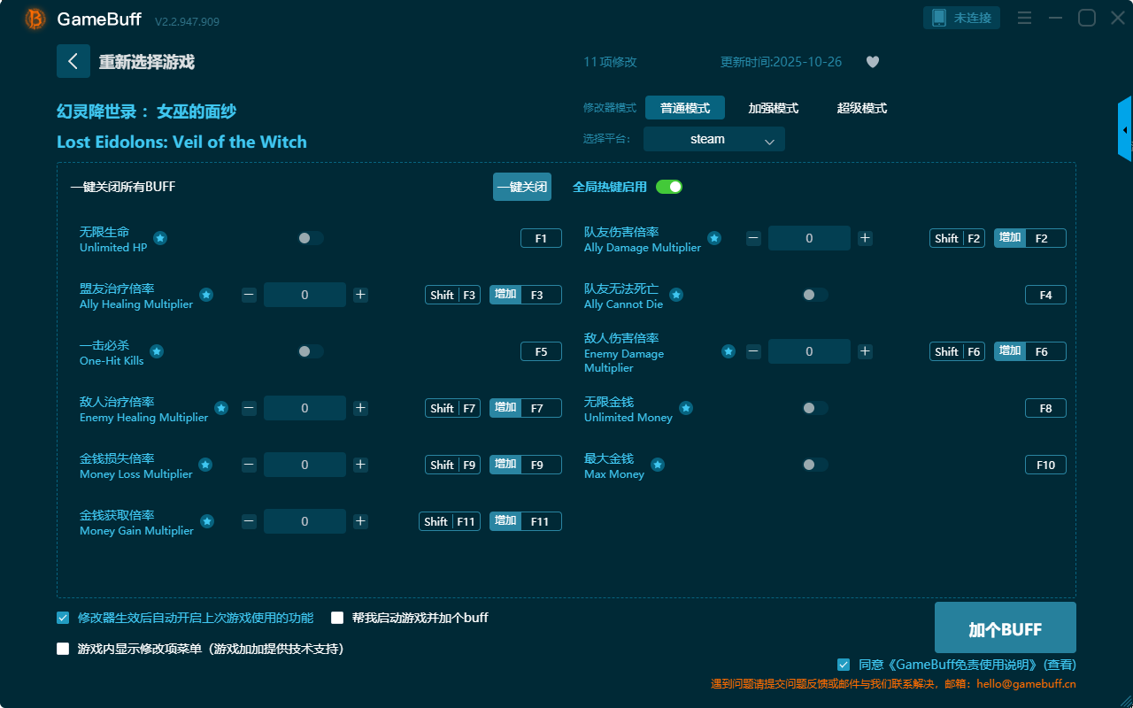 幻灵降世录:女巫的面纱十一项修改器是一款操作极其简单的游戏辅助修改器工具,功能强大实用,可以自由设置拥有无限生命、队友伤害倍率、队友无法死亡、敌人伤害倍率、无限金钱、最大金钱、一击必杀、盟友治疗倍率、金钱获得倍率等十一项功能内容,感兴趣的玩家千万不要错过哦!