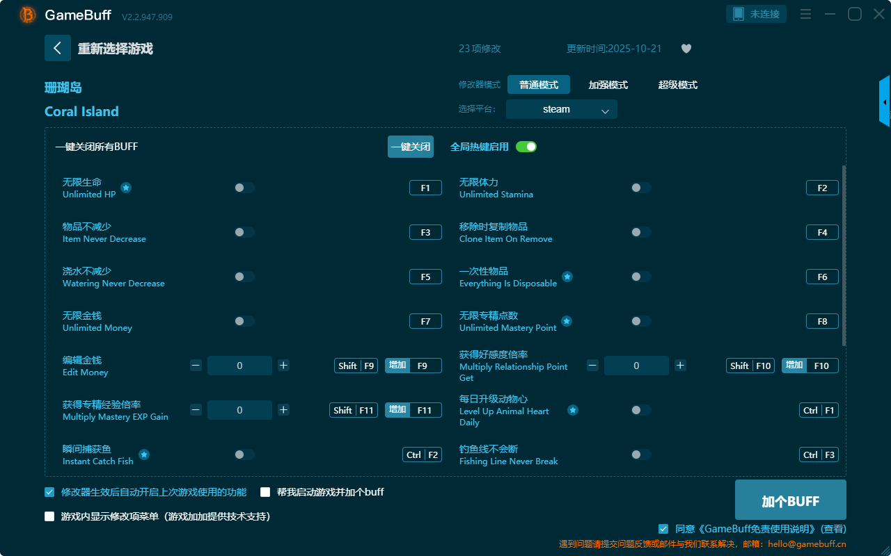珊瑚岛二十三项修改器是一款操作十分简单,功能强大实用的游戏辅助修改器工具,可以自由设置拥有无限生命、无限体力、移除时复制物品、一次性物品、物品不减少、浇水不减少、无限金钱、编辑金钱、瞬间捕获鱼、钓鱼线不会断、倒退一小时、增加一小时、游戏速度、移动速度倍率等二十三项功能内容,感兴趣的玩家千万不要错过哦!