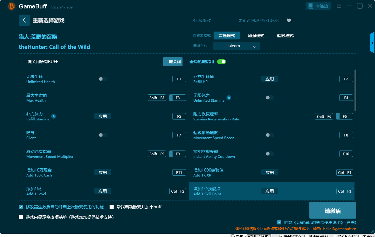 猎人:野性的呼唤四十一项修改器是一款功能十分强大的游戏辅助修改器工具,操作极其简单,可以自由设置拥有无限生命、补充生命值、无限体力、耐力恢复速率、超级移动速度、技能立即冷却、增加1000经验值、增加1个技能点、隐身、补充体力、动物立刻大出血、保存当前位置、设定比赛时间等四十一项功能内容,感兴趣的玩家千万不要错过哦!