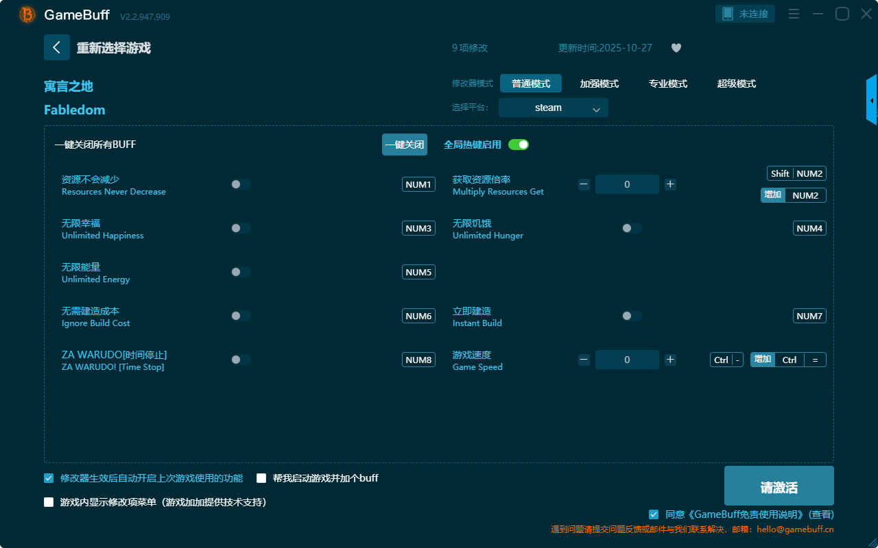 寓言之地九项修改器是一款操作极其简单的游戏辅助修改器工具,功能强大实用,可以自由设置拥有无限幸福、获取资源倍率、无限饥饿、立即建造、游戏速度、无需建造成本、无限能量等九项功能内容,更加沉浸式的体验游戏带来的乐趣与快感,感兴趣的玩家千万不要错过哦!