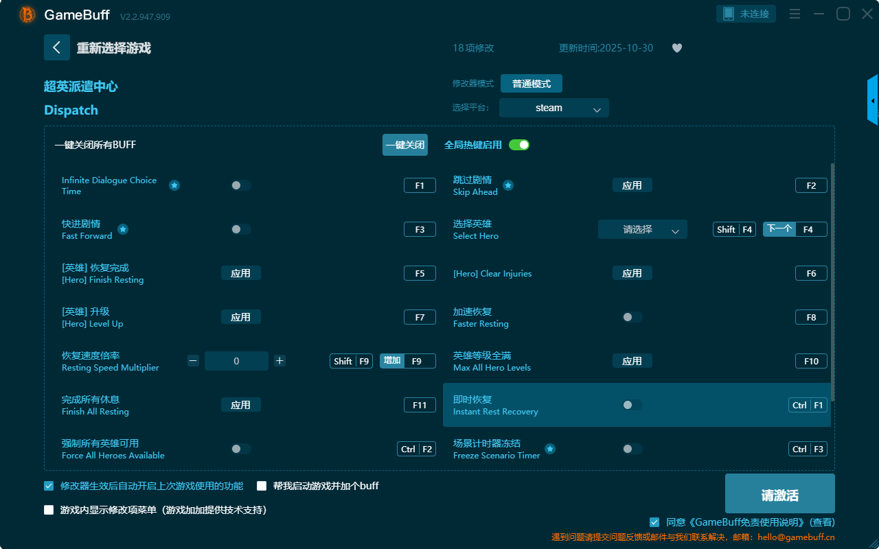Dispatch超英派遣中心十八项修改器是一款功能强大实用的游戏辅助修改器工具,操作也很简单易上手,自由一键设置拥有快进剧情、跳过剧情、加速恢复、即时恢复、英雄等级全满、完成所有休息、升级、恢复完成、强制所有英雄可用、减缓恢复、场景计时器加速、场景计时器倍率、场景计时器冻结等功能,感兴趣的玩家千万不要错过哦!