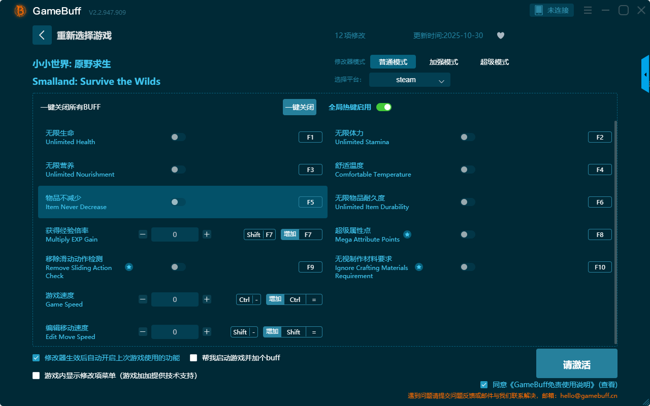 小小世界:原野求生十二项修改器是一款功能强大实用的游戏辅助修改器工具,操作十分的简单趣味,可以自由设置拥有无限生命、无限体力、舒适温度、超级属性点、无视制作材料要求、获取经验倍率、物品不减少、无限营养、游戏速度、编辑移动速度等十二项功能内容,感兴趣的玩家千万不要错过哦!