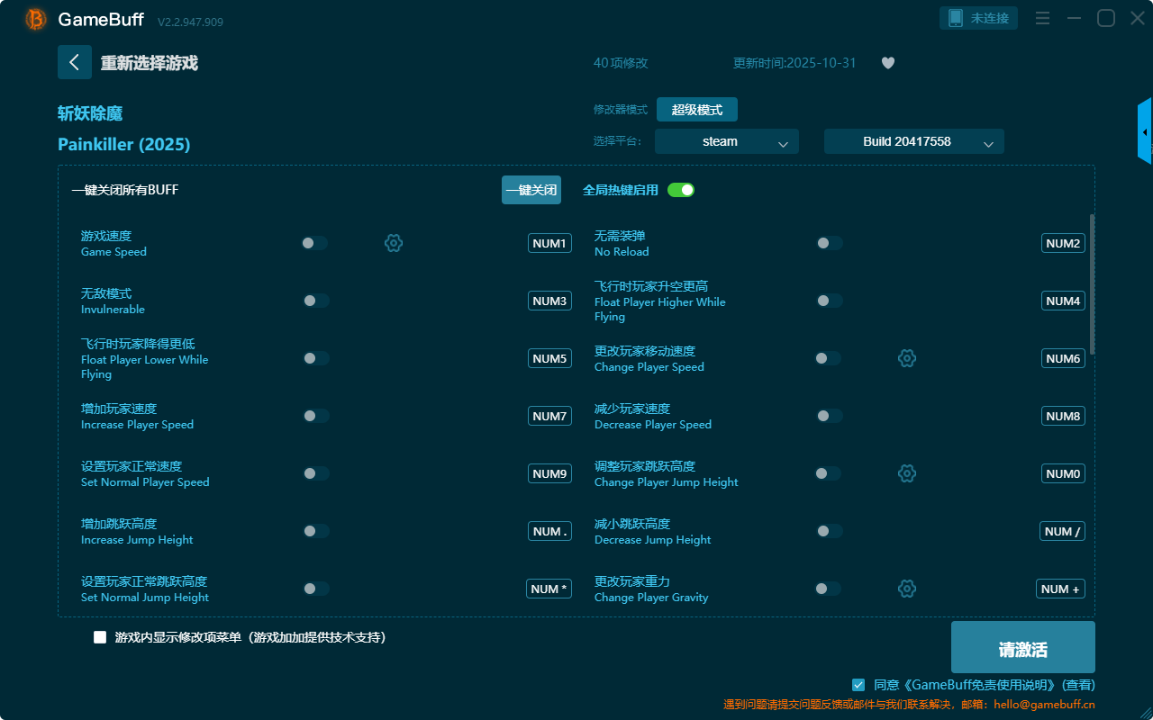 斩妖除魔四十项修改器是一款功能十分强大的游戏辅助修改器工具,根据自己在游戏中遇到的困难自由设置游戏速度、无需装弹、无敌模式、飞行时玩家降得更低、设置玩家正常速度、增加玩家速度、增加跳跃高度、减少玩家速度、减少跳跃高度、更改玩家重力等四十项功能内容,感兴趣的玩家千万不要错过哦!