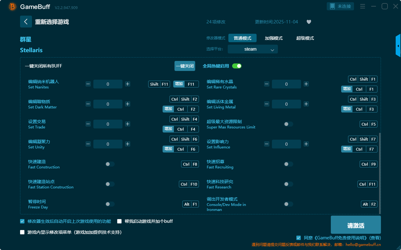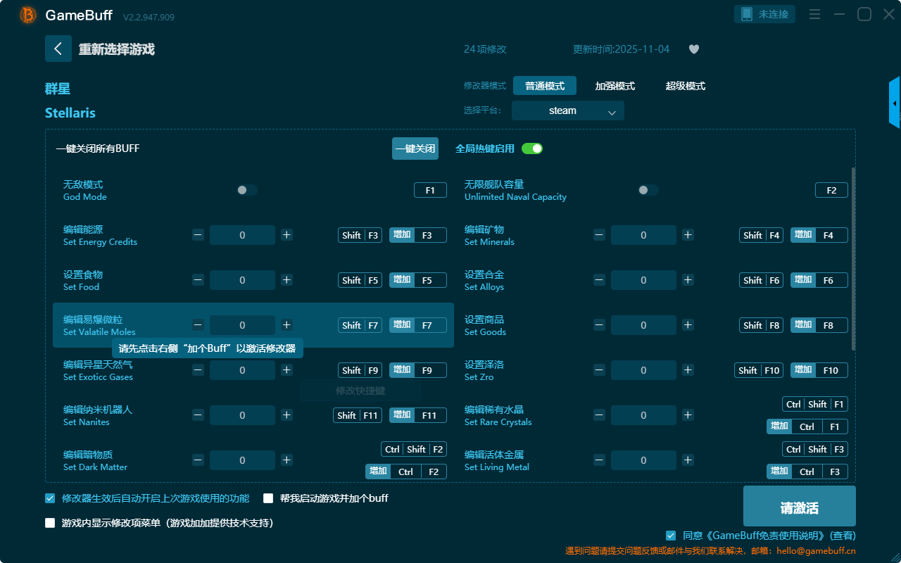 群星二十四项修改器是一款功能强大实用的游戏辅助修改器工具,操作极其简单,可以自由设置拥有无敌模式、编辑能源、无限舰队容量、编辑矿物、设置合金、设置商品、编辑稀有水晶、编辑暗物质、设置食物、编辑活体金属、编辑纳米机器人、设置易爆微粒等二十四项功能内容,感兴趣的玩家千万不要错过哦!