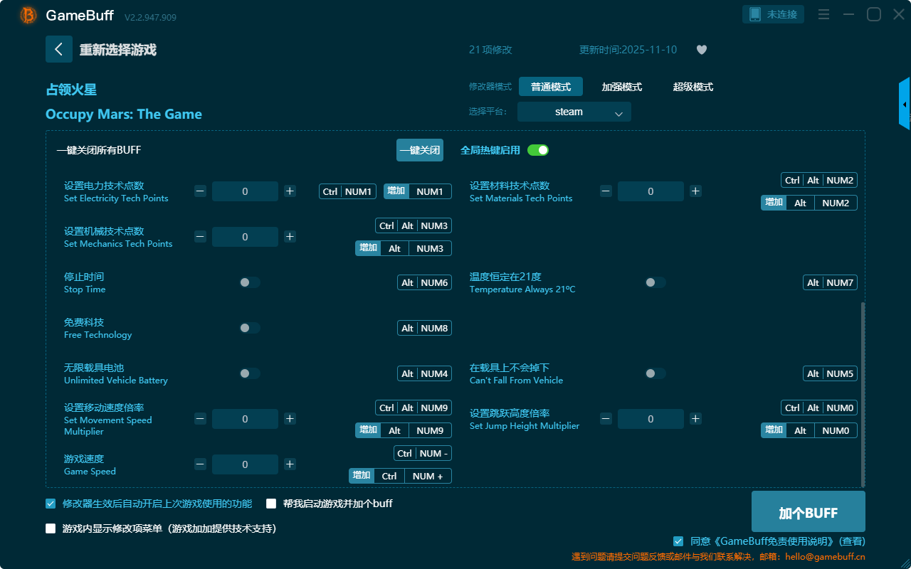 占领火星二十一项修改器是一款操作极其简单的游戏辅助修改器工具,功能也很强大实用,根据本身在游戏中遇到的困难自由设置拥有无限生命、无限体力、不会口渴、无坠落伤害、设置化学技术点、设置植物学技术点数、没有疲劳、满饱腹度、无需套装能量、免费科技、停止时间、游戏速度、设置移动速度倍率、无线载具电池等二十一项功能内容,感兴趣的玩家千万不要错过哦!