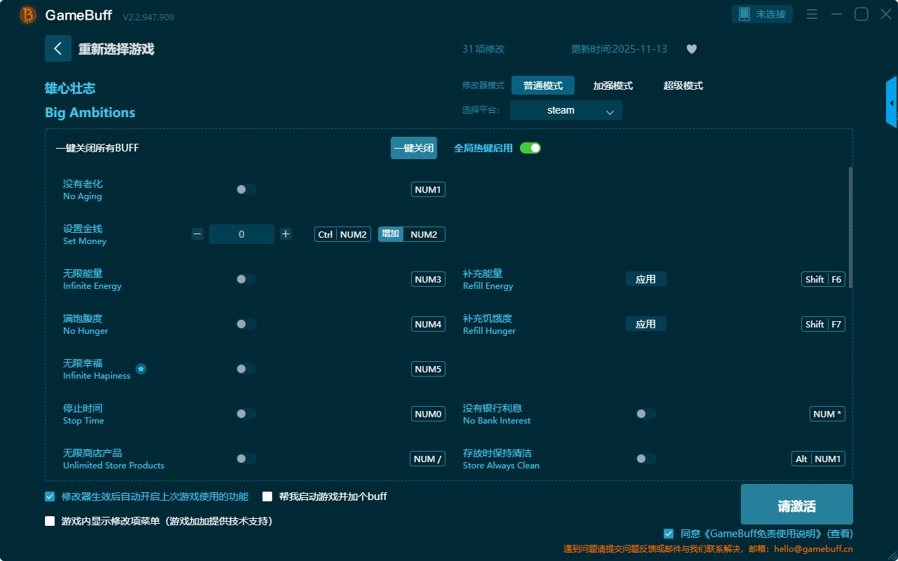 雄心壮志三十一项修改器是一款功能强大操作简单的游戏辅助修改器工具,支持自由设置拥有设置金钱、无限能量、没有老化、补充能量、补充饥饿度、没有银行利息、存放时保持清洁、停止时间、满饱腹度、无限商品产品、设置小时、设置天、设置年份、年龄、无员工需求、无限员工满意度等三十一项功能内容,感兴趣的玩家千万不要错过哦!