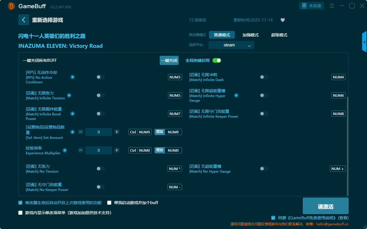闪电十一人英雄们的胜利之路十五项修改器是一款操作极其简单,功能强大实用的游戏辅助修改器工具,支持一键自由设置拥有无限生命、无限张力、无动作冷却、无限冲刺、无限守门员、设置物品数量、经验倍率、无超能量槽等十五项功能内容,感兴趣的玩家千万不要错过哦!