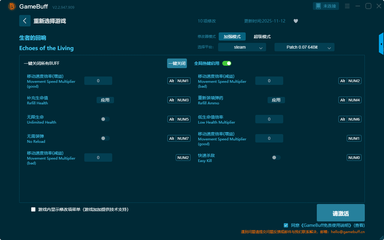 生者的回响十项修改器是一款功能强大的游戏辅助修改器工具,操作也很简单,根据本身在游戏中遇到的困难自由设置拥有十项功能内容,例如移动速度倍率、补充生命值、无限生命、无需装弹、快速杀敌、低生命值倍率、重新装填弹药、快速杀敌等十项功能内容,感兴趣的玩家千万不要错过哦!