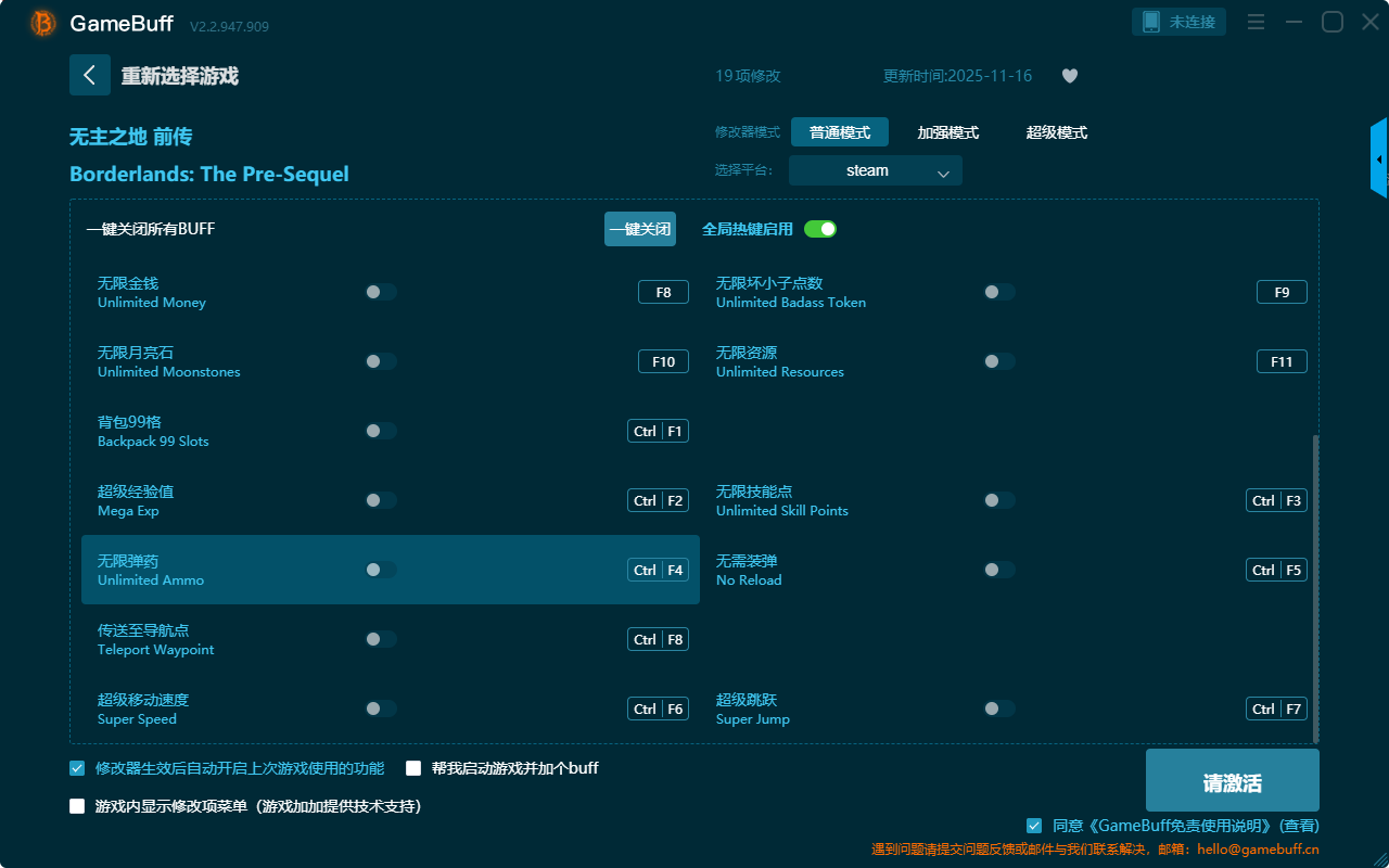 无主之地:前传十九项修改器是一款操作极其简单的游戏辅助修改器工具,功能也很强大实用,可以根据游戏中遇到的困难自由一键设置拥有无限生命、无限护盾、快速击杀、无限车辆生命、无限资源、无限月亮石、无需钥匙、无限金钱、背包99格、瞬间冷却、无限氧气、超级跳跃、传说至导航点等十九项功能内容,感兴趣的玩家千万不要错过哦!