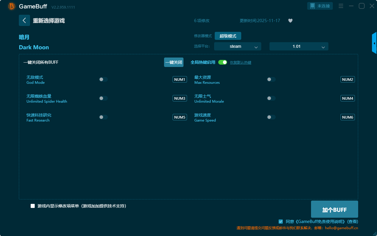 暗月六项修改器是一款操作极其简单的游戏辅助修改器工具,功能也很强大实用,自由根据本身在游戏中遇到的困难与挑战一键设置拥有无敌模式、最大资源、无限士气、游戏速度、快速科技研究、无限蜘蛛血量等六项功能内容,感兴趣的玩家千万不要错过哦!