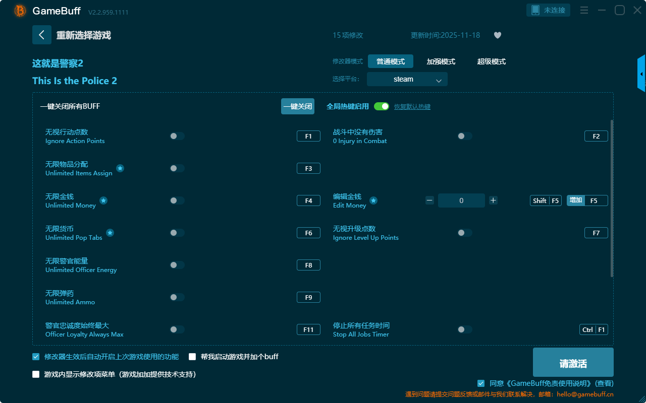 这就是警察2十五项修改器是一款功能强大实用的游戏辅助GameBuff修改器工具,根据本身在游戏中遇到的困难与挑战自由一键设置拥有无视行动点数、无限物品分配、无限金钱、无限弹药、无限货币、战斗中没有伤害、编辑金钱、停止所有任务时间、警官忠诚度始终最大等十五项功能内容,感兴趣的玩家千万不要错过哦!