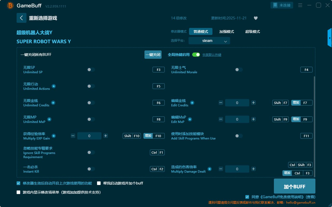 超级机器人大战Y十四项修改器是一款功能强大实用的游戏辅助修改器工具,操作极其简单,根据本身在游戏中遇到的困难与挑战,自由设置拥有无敌模式、无限士气、无限SP、编辑金钱、无限EN、无限行动、无限金钱、获取经验倍率、使用时添加技能模块、一击必杀、造成的伤害倍率等十四项功能内容,感兴趣的玩家千万不要错过哦!