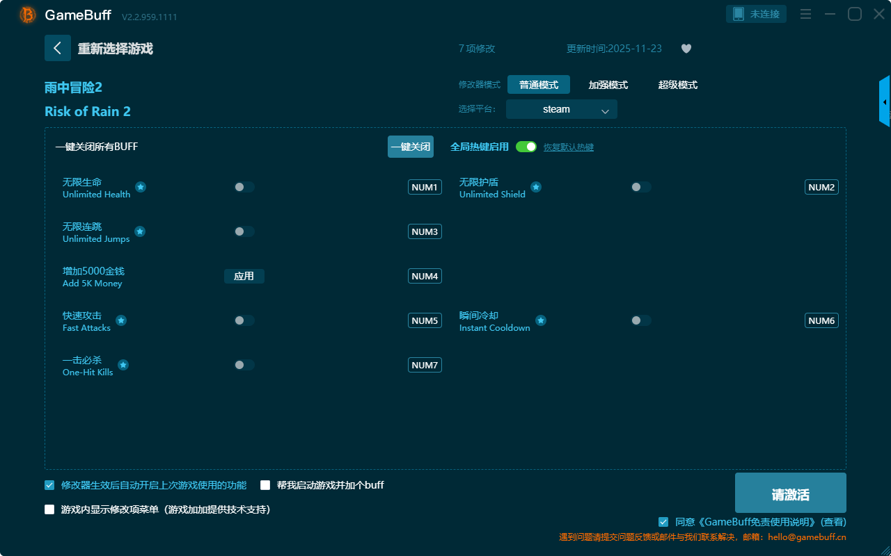 雨中冒险2七项修改器是一款玩起来十分的简单的游戏辅助修改器工具,操作极其的简单,支持自由设置拥有无限生命、无限护盾、瞬间冷却、无限连跳、增加5000金钱、快速攻击、一击必杀等七项功能内容,沉浸式享受游戏的乐趣快感,感兴趣的玩家千万不要错过哦!