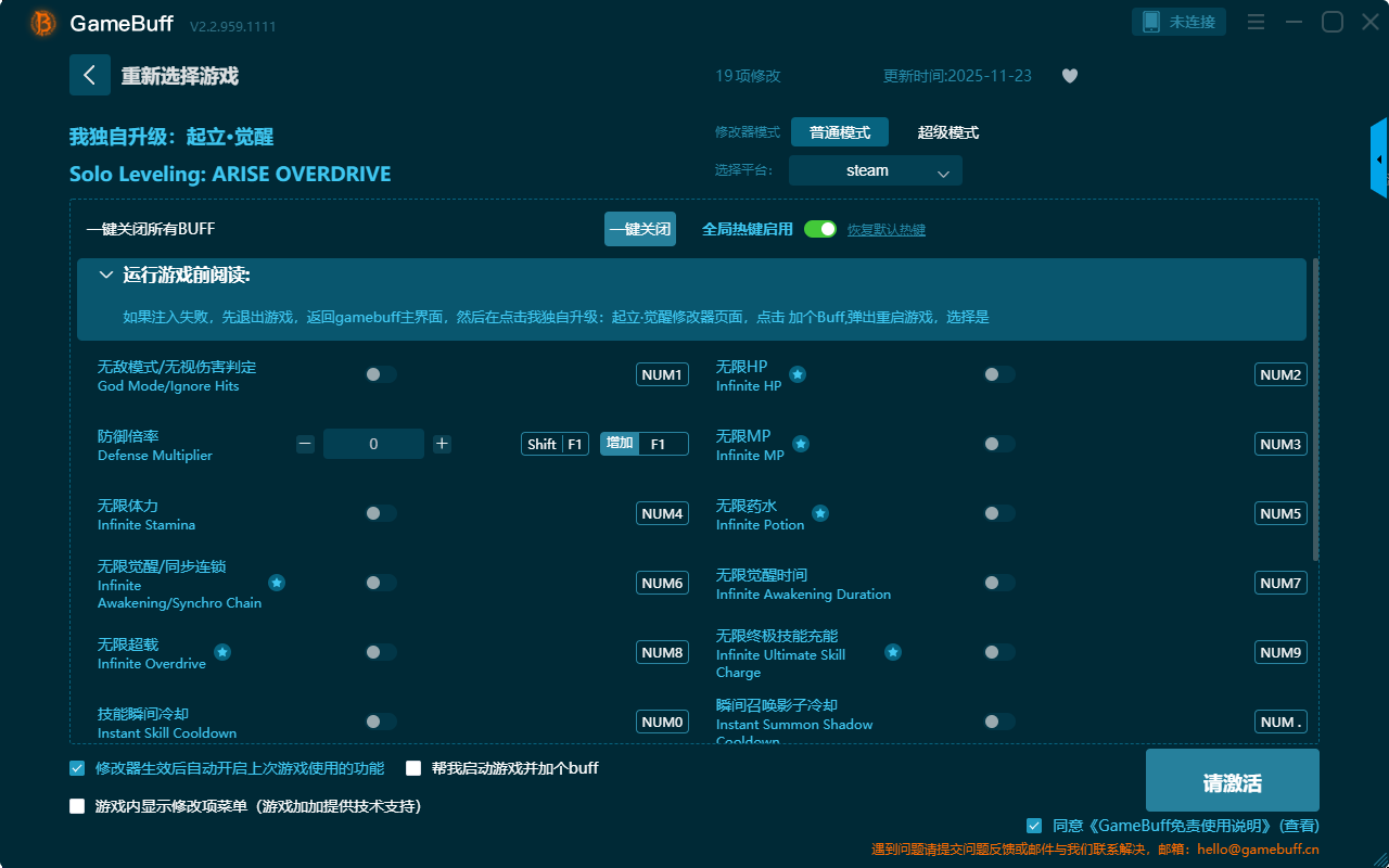 我独自升级:起立·觉醒十九项修改器是一款专为我独自升级:起立·觉醒这款游戏打造的游戏辅助修改器工具,功能强大实用,操作简单,支持一键设置拥有无敌模式、无限体力、无限HP、无限MP、无限药水、无限觉醒、技能瞬间冷却、超级伤害、一击击倒、一击必杀、伤害倍率、击倒倍率等十九项功能内容,感兴趣玩家快来当游网下载体验一下吧!