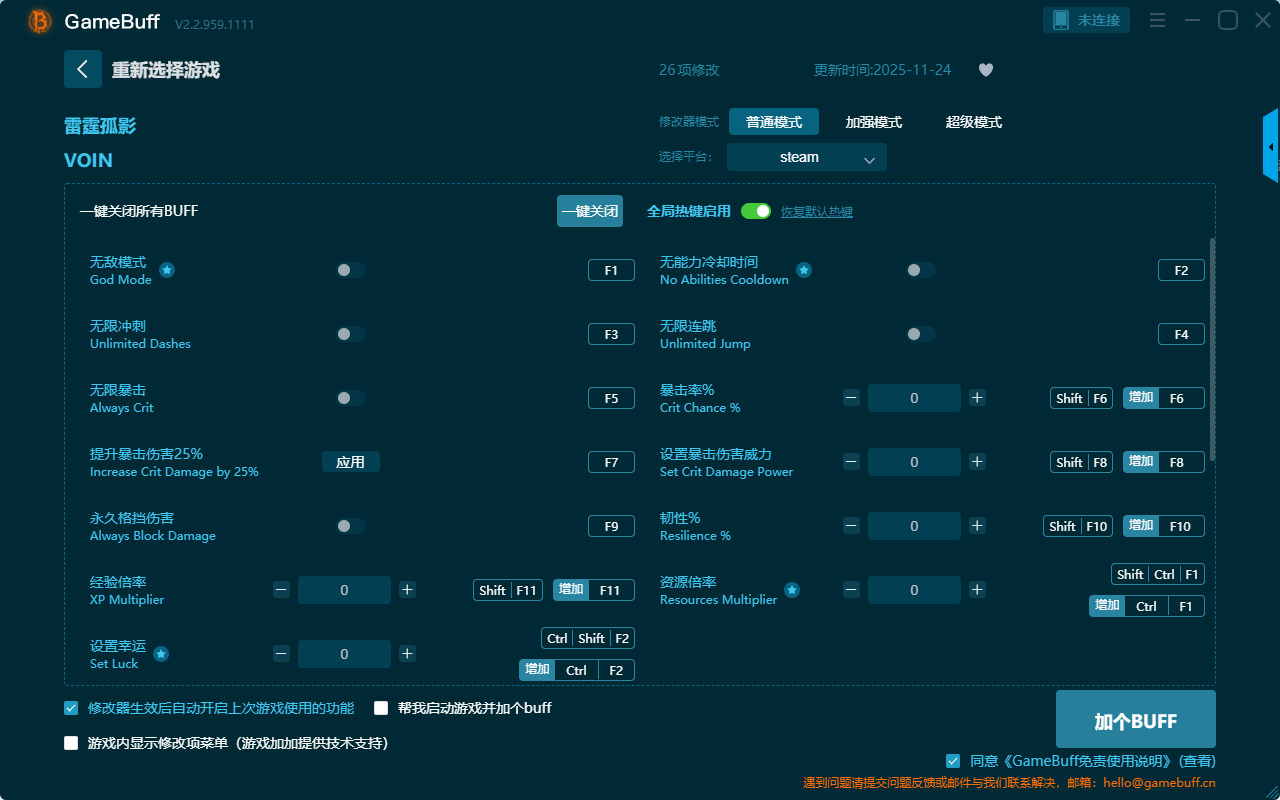 雷霆孤影二十六项修改器是一款功能强大的游戏辅助修改器工具,操作也很简单易上手,将自由根据本身在游戏中遇到的困难一键设置拥有一击必杀、设定伤害倍率、自由视角、长伤害范围、高清截图、超级移动速度、视野范围、玩家速度倍率、重力比例、跳跃高度倍率、超级跳跃、无限冲刺、无限暴击等二十六项功能内容,感兴趣的玩家千万不要错过哦!