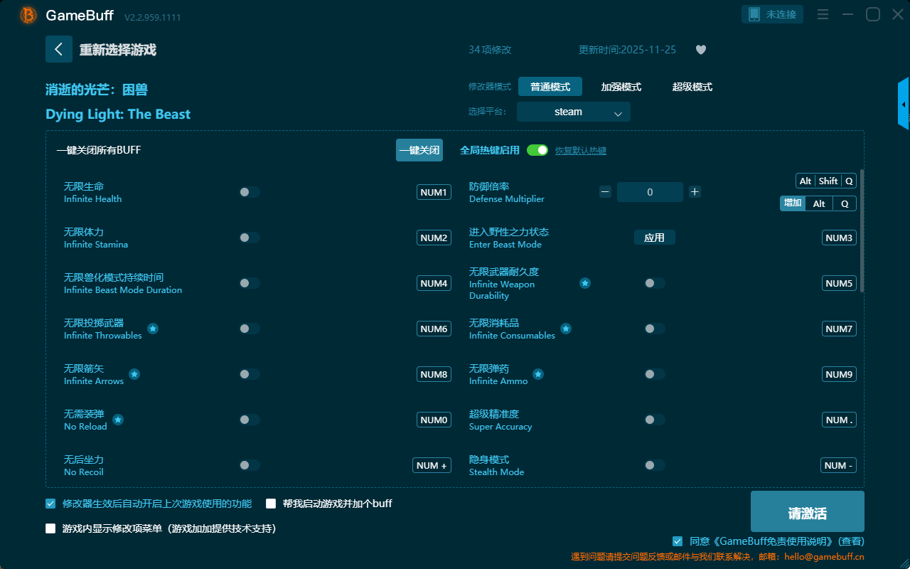 消逝的光芒:困兽三十四项修改器是一款功能强大实用的游戏辅助修改器工具,支持自由设置拥有无限生命、无限体力、无需装弹、无限弹药、隐身模式、无限武器耐久度、无限消耗品、超级精准度、伤害倍率、经验倍率、一击必杀、超级伤害、保存位置、锁定当天时间、无限经验值、当天时间+1小时等三十四项功能内容,感兴趣的玩家快来本站下载体验吧!
