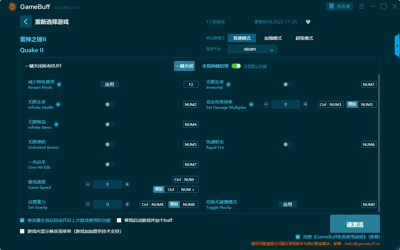 雷神之锤2十一项修改器是一款操作十分简单的游戏辅助修改器工具,支持一键设置拥有减少特性费用、无限生命、设定伤害倍率、快速射击、切换无碰撞模式、一击必杀、无限物品、无限弹药、游戏速度、设置重力等十一项功能内容,沉浸式体验游戏带来的乐趣,感兴趣的玩家快来当游网下载体验一下吧!