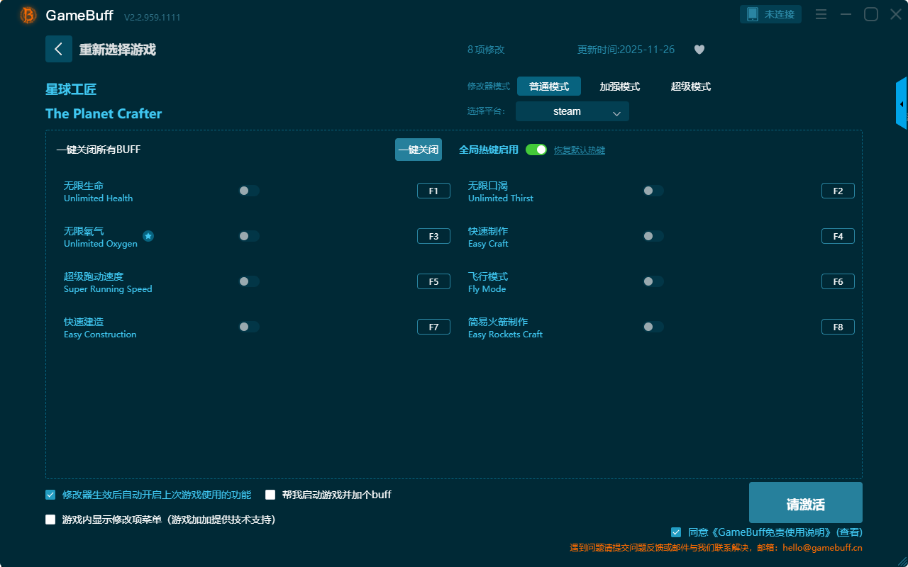 星球工匠八项修改器是一款操作极其简单的游戏辅助修改器工具,支持一键设置拥有无限生命、无限口渴、快速制作、飞行模式、简易火箭制作、快速建造、超级跑动速度、无限氧气等八项功能内容,更加沉浸式的体验游戏带来的乐趣与快感,感兴趣的玩家千万不要错过哦!