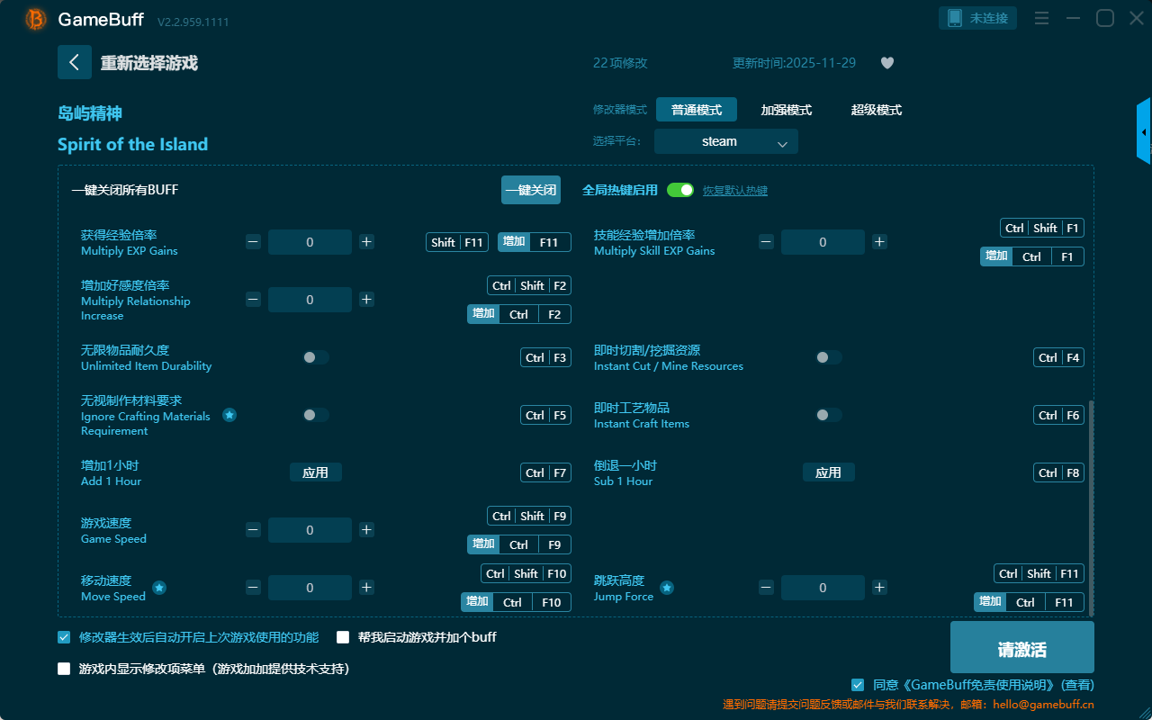 5、等待显示“BUFF加持成功”后,我们就可以在岛屿精神游戏中使用按键来快速激活和关闭对应的修改器功能了